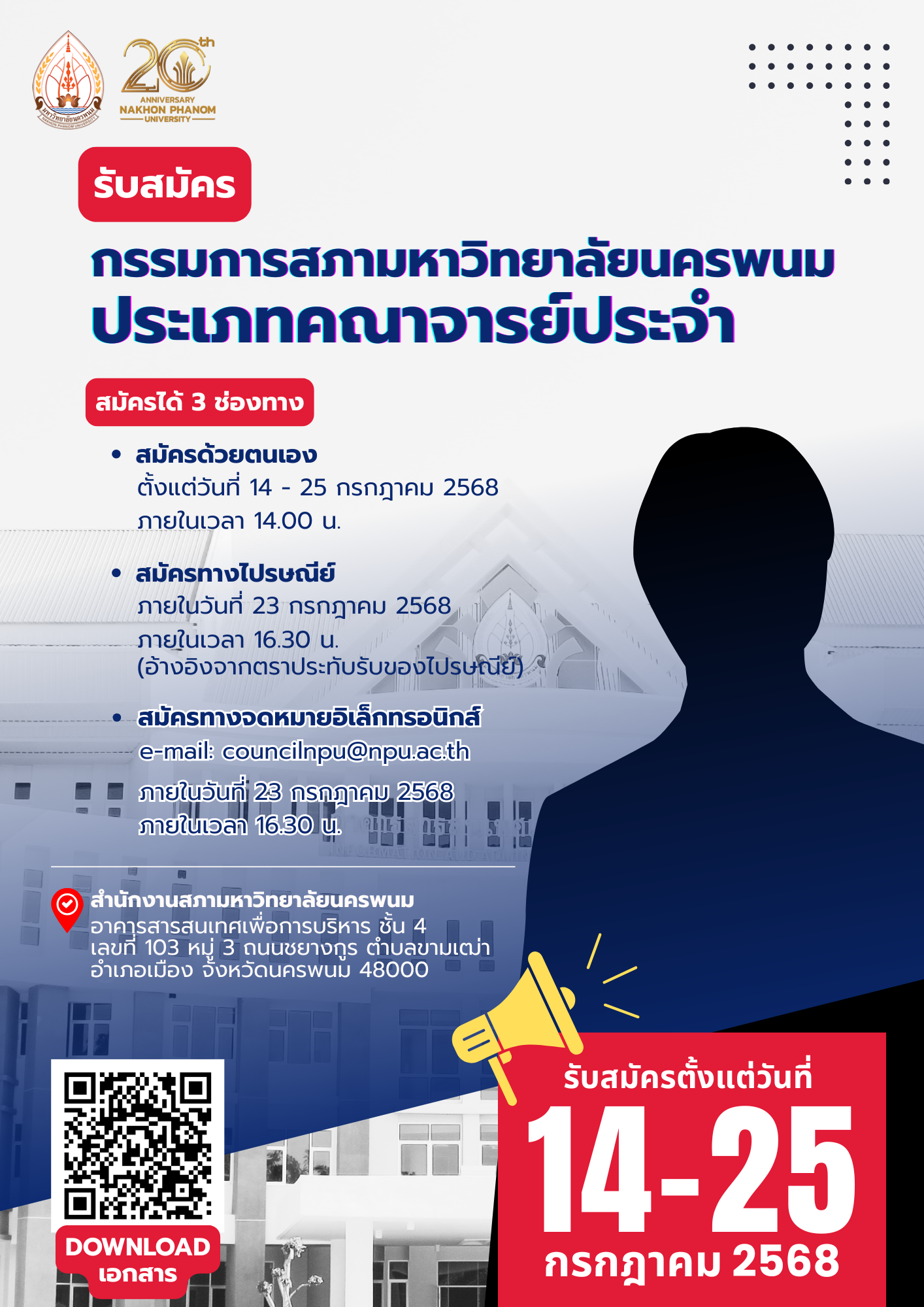 ขอเชิญชวนคณาจารย์ประจำมหาวิทยาลัยนครพนม (ที่มีคุณสมบัติตามประกาศมหาวิทยาลัยนครพนม) สมัครรับเลือกตั้งเป็น “กรรมการสภามหาวิทยาลัยนครพนม ประเภทคณาจารย์ประจำ”เปิดรับสมัครตั้งแต่วันที่ 14 กรกฎาคม ถึงวันที่ 25 กรกฎาคม 2568