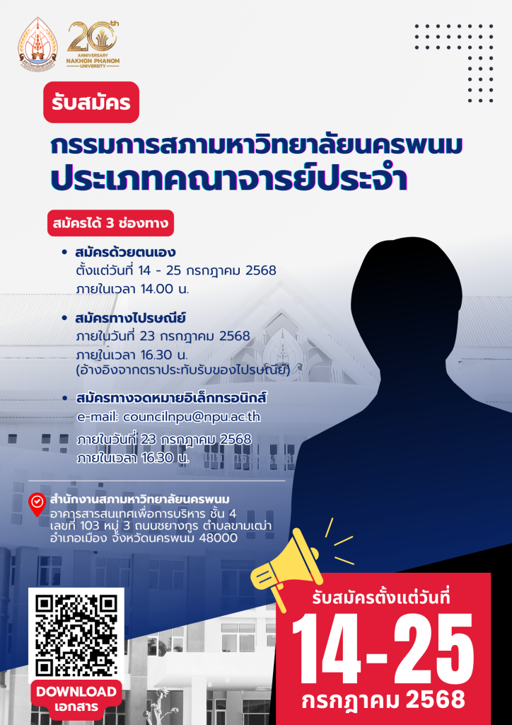 อีเมลสำนักงานสภามหาวิทยาลัยนครพนม councilnpu@npu.ac.th ภายในวันที่ 23 กรกฎาคม 2568 เวลา 16.30 น. โดยอ้างอิงเวาลามาตรฐานประเทศไทยเป็นสำคัญ
